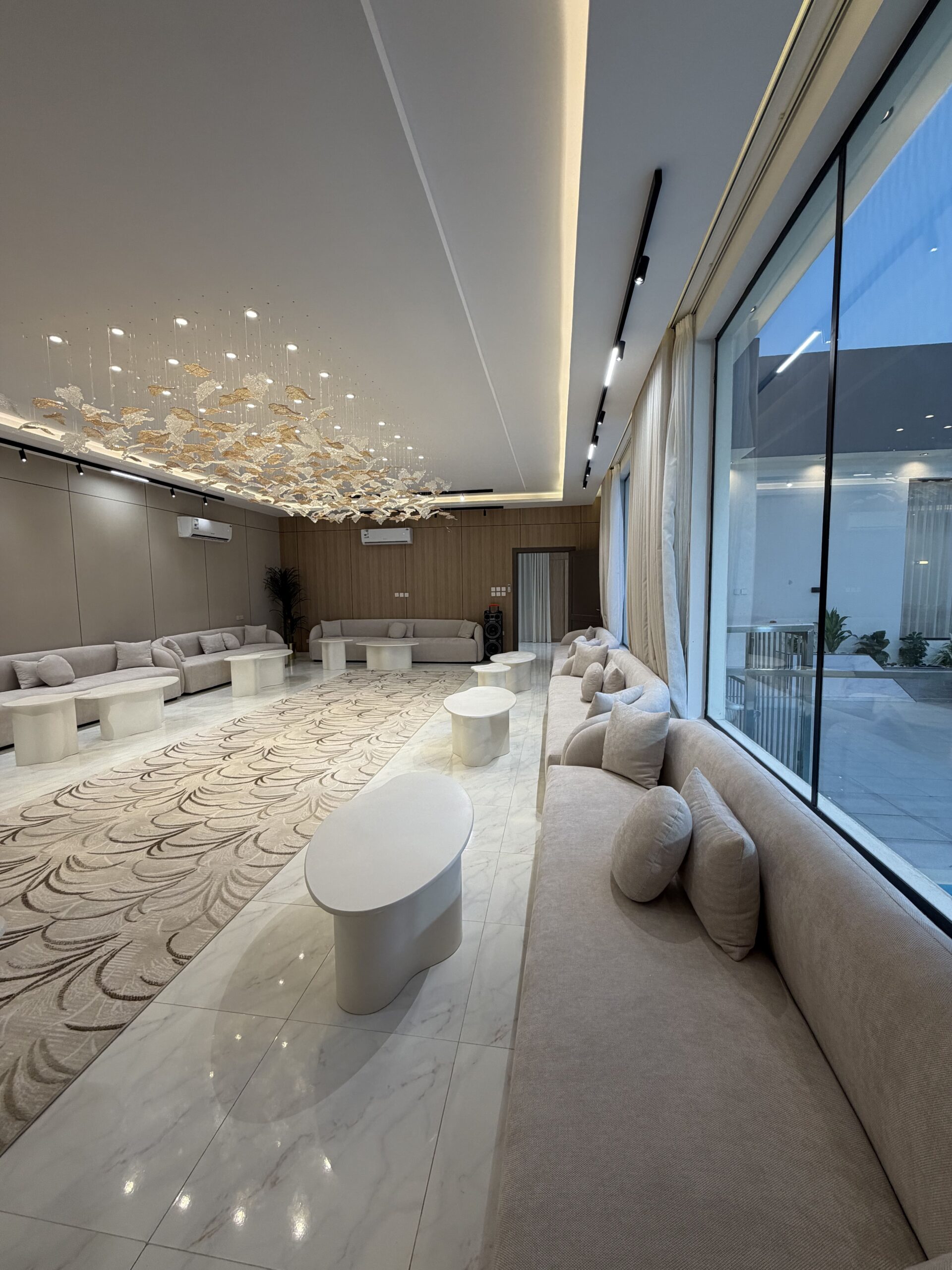 - مجلس رئيسي (12*7م) يتسع لـ 60 شخص - واجهات زجاجية مطله على الشاليه